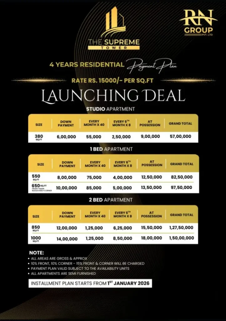 The Supreme Tower reflects RN Group’s vision of affordable luxury, smart planning, and future-ready living. Whether you are:
